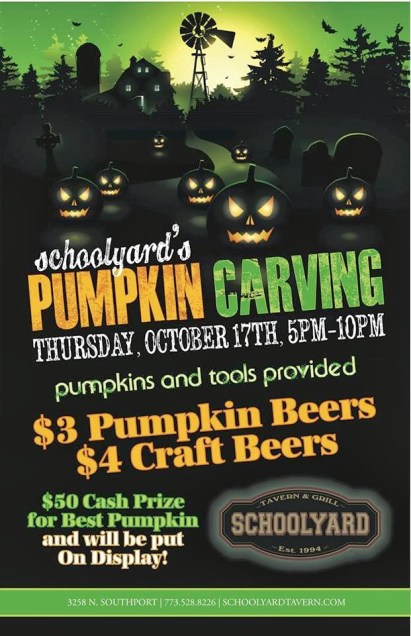 Schoolyard Tavern’s Pumpkin Carving Party – Thursday, October 17 from 5PM – 10PM Share this: Click to share on X (Opens in new window) X Click to share on Facebook (Opens in new window) Facebook Like Loading... Related