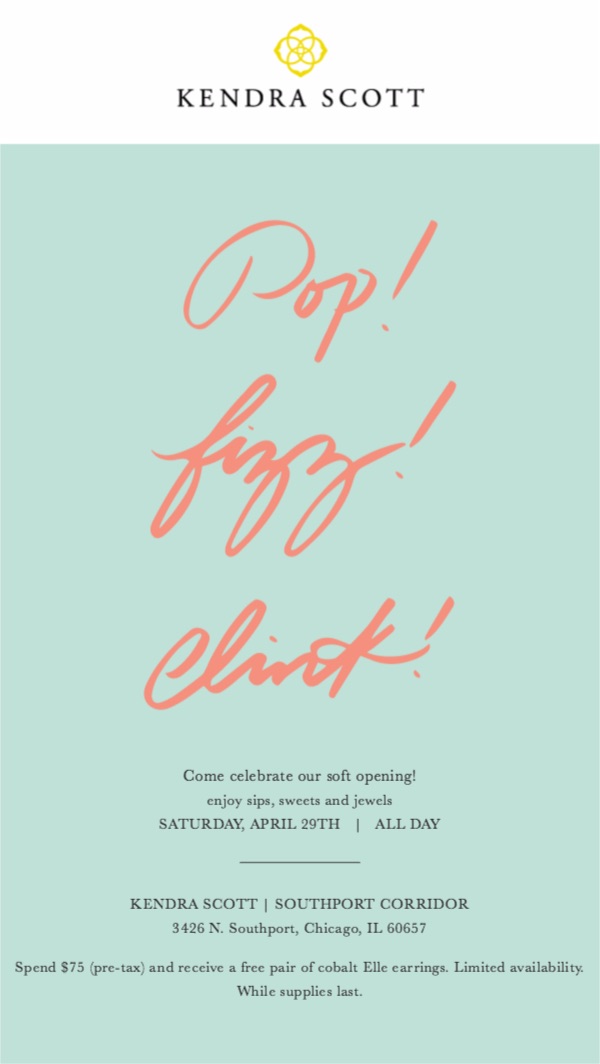 Ready for Kendra Scott to join The ‘Port? The store will be opening on Friday, April 28 and will be hosting a soft opening party of Saturday, April 29. In celebration of their opening, they will have sips, sweets and a gift with purchase – Cobalt (cubby!) blue Elle earrings when you spend $75 or more. The event invite and more details are below.