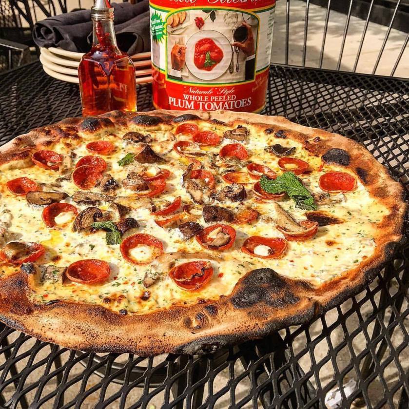 Ezzo Pepperoni @ezzosausageco Mushrooms from @rivervalleykitchens Basil Cream @gothamgreens Mozzarella. Mint. #coalfirechicago (at Coalfire)