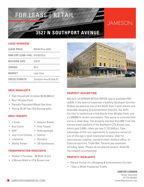 “829 sq.ft. of CORNER RETAIL/OFFICE space available FOR LEASE in the heart of Lakeview’s bustling Southport Corridor. Widely accepted as one of the North Side’s most vibrant and desirable shopping & entertainment districts, the SoPo Corridor is nestled just a few blocks from Wrigley Field, and its $500M in recent renovations. This space is currently built out as a retail shop. The property sits less than 800′ from the entrance/exit platform of the Southport CTA Brown Line, which gets 3,600+ riders per day (1,137,842/yr). Take advantage of this rare opportunity to capture a corner on one of Chicago’s most celebrated streets. Ideal for omnichannel retailing, standard retail, medical office, or financial services. Triple Net: Tenants pay expenses including taxes. Please do not disturb tenants. Need 48 hours/agent accompanied.”