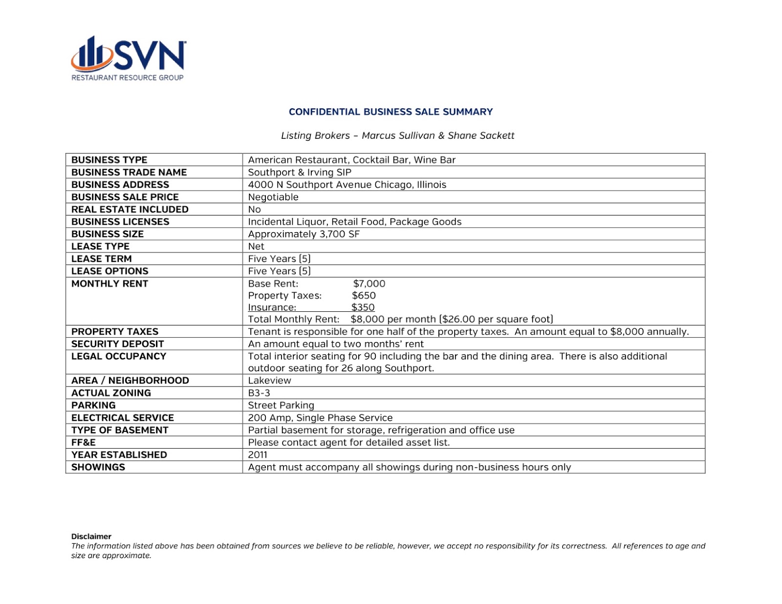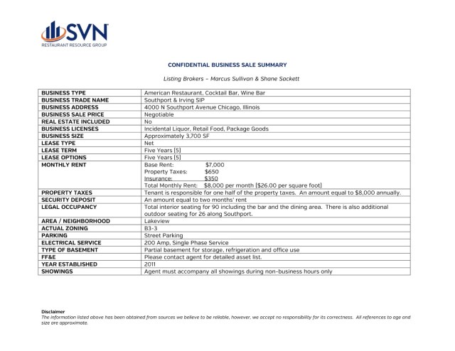 “Southport Corridor Corner Restaurant and Bar. Fully built-out restaurant space with outdoor component. Corner location. Southport and Irving \”SIP\” is located in Chicago\’s Lakeview neighborhood and a part of the City\’s well know Southport Corridor. Within the last several years, the area\’s gained momentum as a trendy shopping and dining district, offering a nice mix of popular chains as well as independently owned specialty shops and restaurants. The corridor gives out-of-town shoppers and locals a chance to stray away from the ?Mag Mile shopping district and into a real Chicago neighborhood. The area boasts some of the high demographics in the City and is easily accessible from all over the City.”