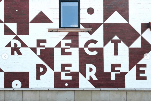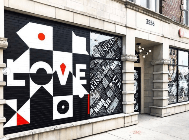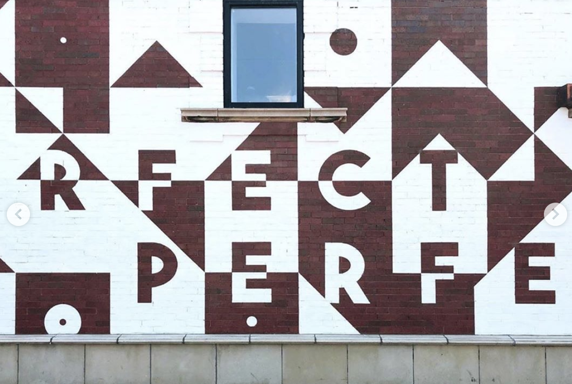 “@lululemon is a wrap! I am so proud to have 2 new murals fill the exterior walls of the Lakeview location, at Southport + Addison ❤️ Inspired by the work of mid-century designer Alexander Girard, these pieces were created with a vision of combining my love for lettering and pattern, minimalist palette, and positive messages that aligned with the brand – LOVE and IMPERFECT IS PERFECT. Words we can all appreciate, especially during those times when we\’re too hard on ourselves. It was a dream to paint outside in the sunshine the past few weeks, and I’m so thankful to the kind neighbors, and friends, and dogs that popped by during this project to say hello and watch the progress. Thank you Lululemon for this experience, completely trusting my vision and seeing the value in creating opportunities for independent artists 🙏🏼”