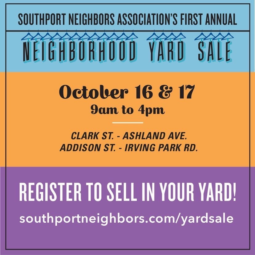To participate, go to southportneighbors.com/yardsale and follow the instructions. The city requires all participants to complete certain forms & supply proof of residency, so please make sure to follow the website directions carefully. All paperwork and fees must be returned by Saturday, October 4 to 3832 N Janssen in order to participate — you can either mail or place it in the marked box on the front porch.