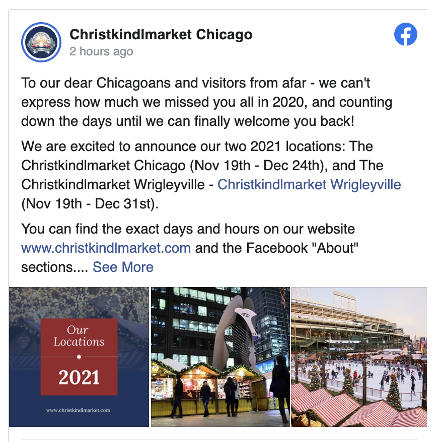 “To our dear Chicagoans and visitors from afar – we can’t express how much we missed you all in 2020, and counting down the days until we can finally welcome you back!” organizers said in a Facebook post.