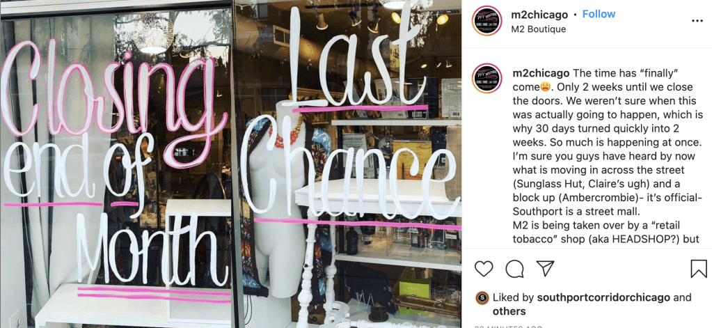 “The time has “finally” come😩. Only 2 weeks until we close the doors. We weren’t sure when this was actually going to happen, which is why 30 days turned quickly into 2 weeks. So much is happening at once. I’m sure you guys have heard by now what is moving in across the street (Sunglass Hut, Claire’s ugh) and a block up (Ambercrombie)- it’s official- Southport is a street mall.