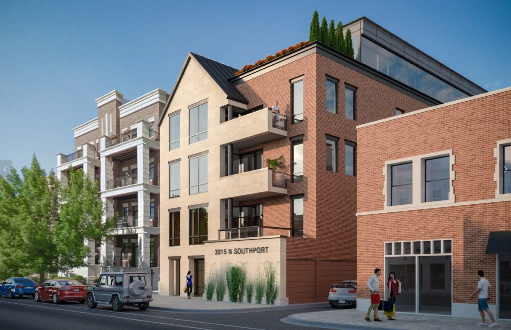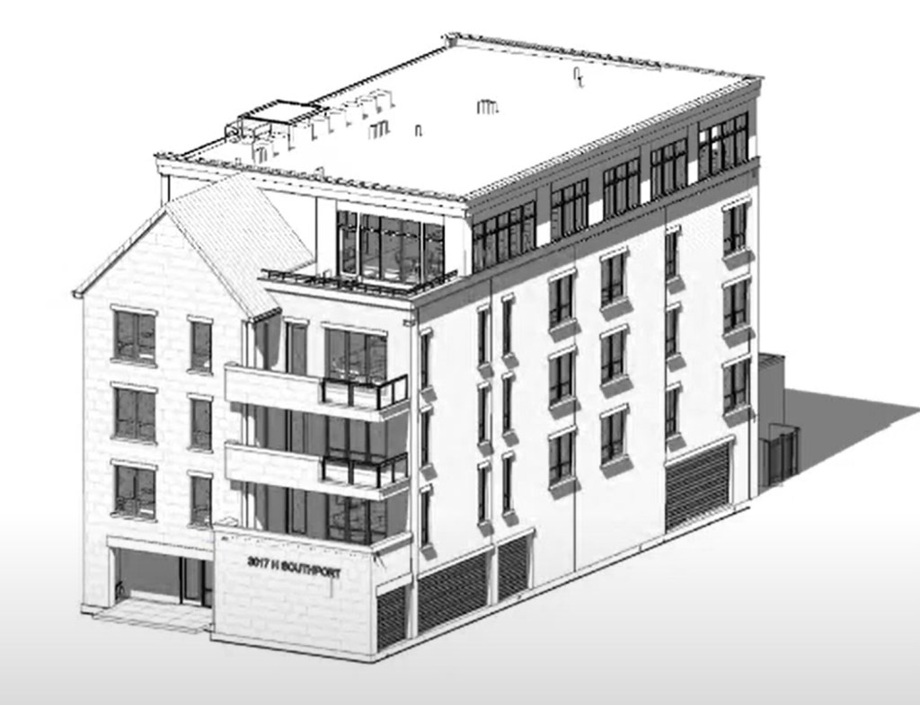 Designed by OKW Architects, the new construction will be a five-story residential building. This is the secondary phase of an adjacent reuse project at 3001 N Southport Avenue. The project will hold seven residential dwelling units and 13 parking spaces. Six of the parking spaces will be used for the adjacent property.