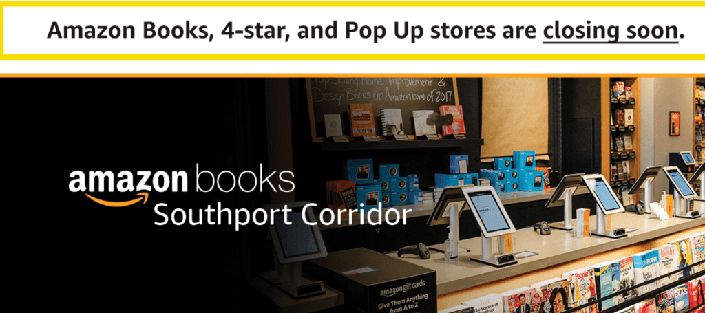 “All Amazon Books, 4-star and Pop Up physical store locations will be closing soon. These closures do not impact other Amazon physical store locations such as Amazon Go, Amazon Fresh and Whole Foods Market.