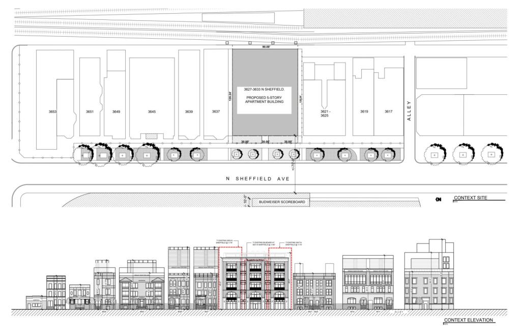 A proposal for a residential development is underway at 3627 N. Sheffield, situated between W. Addison St and W. Waveland Ave, midblock. The project is positioned directly across from Wrigley Field. Crafted by DXU Architects, the five-story building is slated to reach a height of 69 feet. Its facade will feature a combination of brick, stone copings, and decorative metal panels and arches.