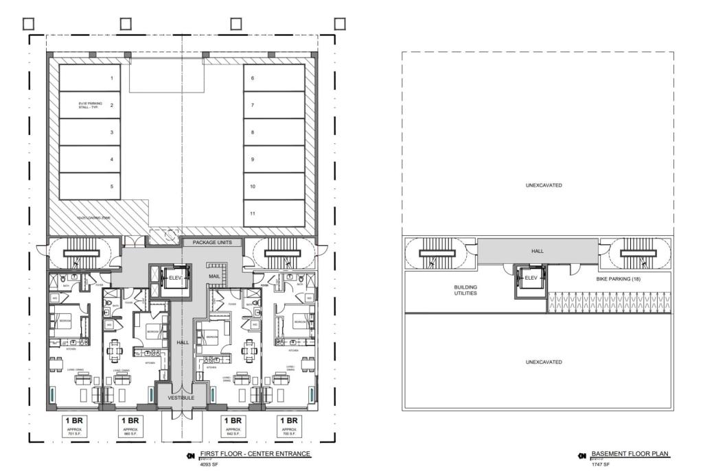 The ground floor will host the residential entry at the center of the frontage, flanked by four one-bedroom units. The back half of the ground floor is designated for 11 parking spaces, with an additional 18 bike spaces located in the basement. The project comprises a total of 29 residential units, including 13 one-bedroom, 14 two-bedroom, and two three-bedroom units.