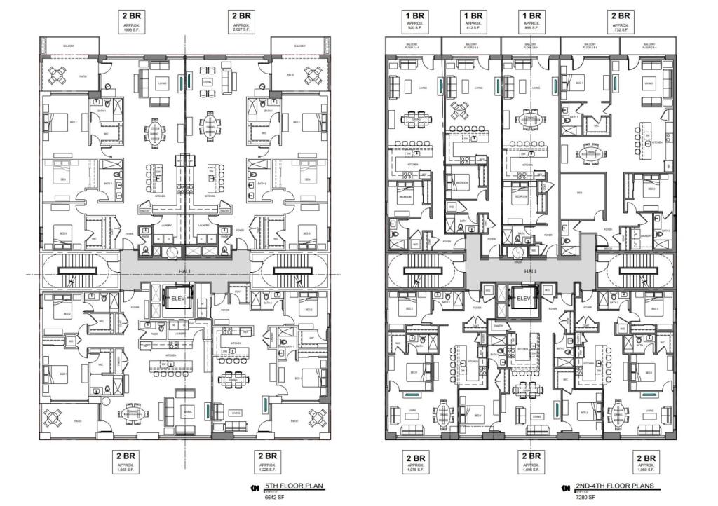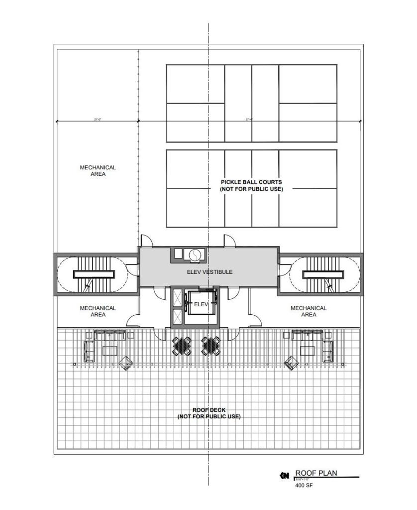 On the second through fourth floors, each level will accommodate seven units, comprising three one-bedroom and four two-bedroom units. The fifth floor will house four units, with two two-bedroom and two three-bedroom options. Residents will enjoy access to a shared rooftop deck featuring outdoor space, seating, and pickleball courts.