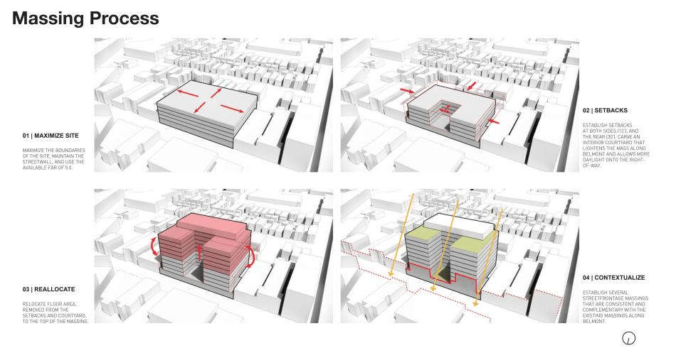Standing at 120 feet tall, the development is slated to offer 210 residential units, including 90 studios, 43 junior one-beds, 58 one-beds, and 19 two-beds. The ground level will host 9,913 square feet of retail space facing W. Belmont Ave, with residential entry positioned at the street’s westernmost end. Additionally, amenities such as a bike room and 36 parking spots in an open surface lot partially underneath the building will be provided.