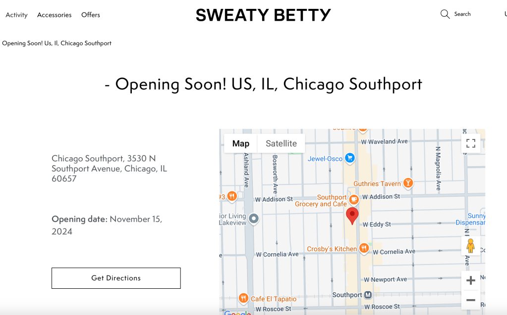 Popular British activewear brand Sweaty Betty is making its way to the Southport Corridor, opening its doors at 3530 N. Southport Avenue on November 15, 2024. This is the former Ink + Alloy location next to Clarie’s.