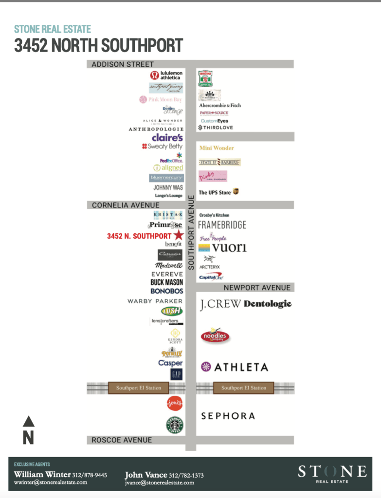 The listing by Stone Real Estate describes the property as an exceptional branding opportunity for retailers, emphasizing its prime location along Southport’s bustling boutique street. The 1,792-square-foot space is situated amidst prominent retailers such as Warby Parker, Anthropologie, Athleta, Bonobos, J.Crew, Buck Mason, Lululemon, and others. Its proximity to Southport’s “L” station further enhances its appeal to potential tenants.