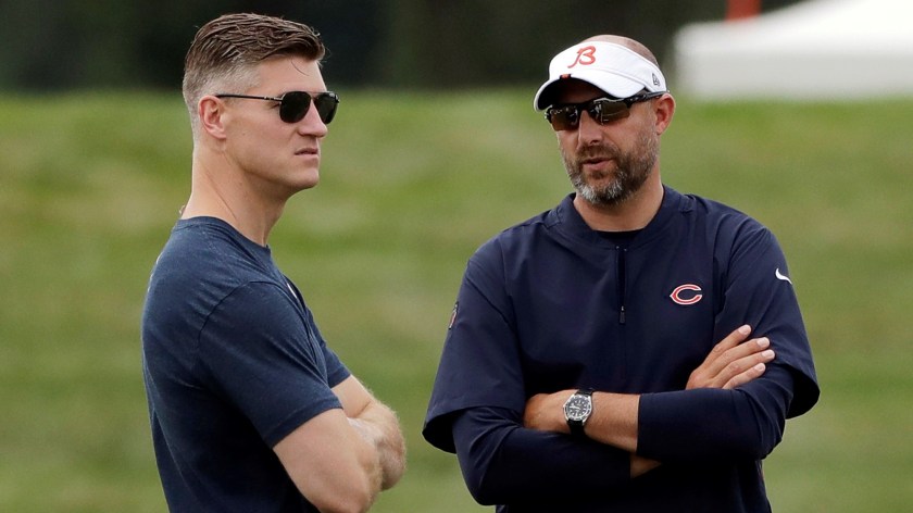 FILE – In this July 26, 2019, file photo, Chicago Bears head coach Matt Nagy, right, talks with general manager Ryan Pace during NFL football training camp in Bourbonnais, Ill. Coach Matt Nagy is ready to call plays again on offense for the Chicago Bears. Nagy said Friday, April 2, 2021, he is taking back those duties after handing them off to offensive coordinator Bill Lazor midway through last season in an effort to shake up a struggling team. Chairman George McCaskey opted to stick with Nagy and Pace, citing their leadership and the way the team handled the big losing streak last season. (AP Photo/Nam Y. Huh, File)