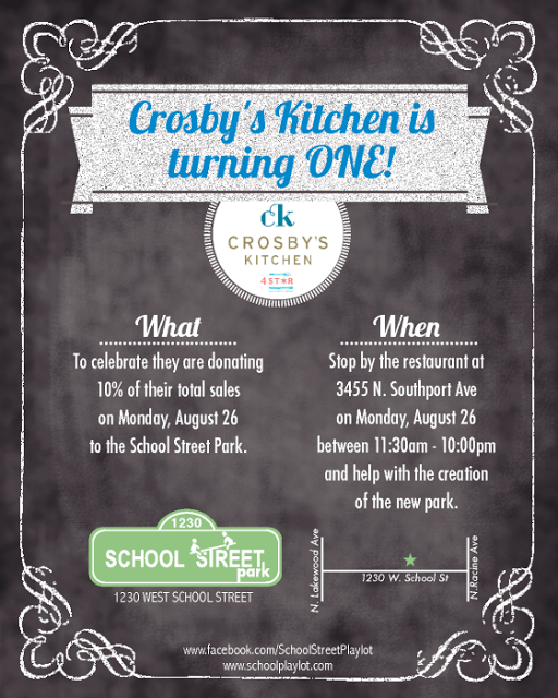 Crosby’s Kitchen donating 10% of their sales on Monday, August 26 to the School Street Park.