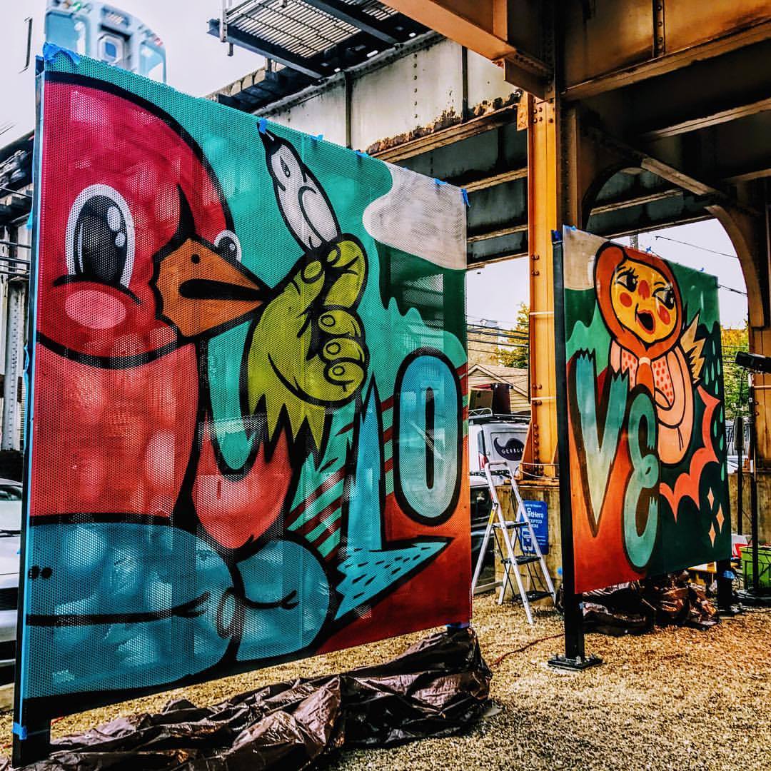 @sentrock hittin’ em with that Southport Style. #chicago #Illinois #lakeview #lakeviewchamberofcommerce #lowlinemarket #interactiveart #installation #cta #brownline #southport #plaza #octopusgraveyard #Sentrock #love #home #birdmask #hooddreams #urbanart #streetart #publicart #art #panels #southportstyle (at Southport Corridor News and Events – Chicago, Illinois)