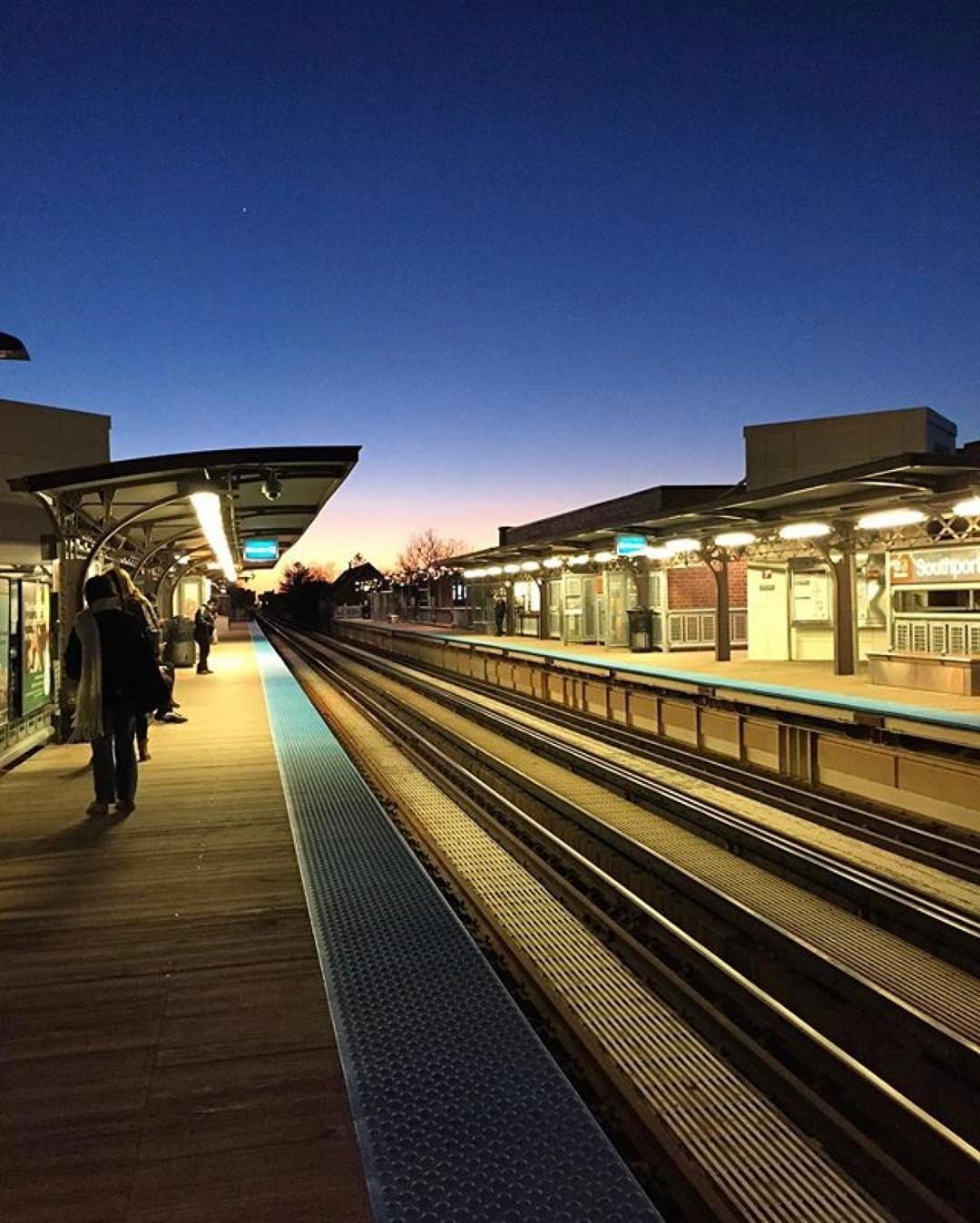 #Sunset 🌅 hour! #chicago #southportstation #cta #train #eltrain #theel #trainplatform (at Southport Corridor News and Events – Chicago, Illinois)